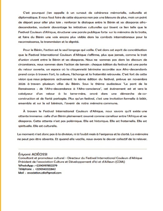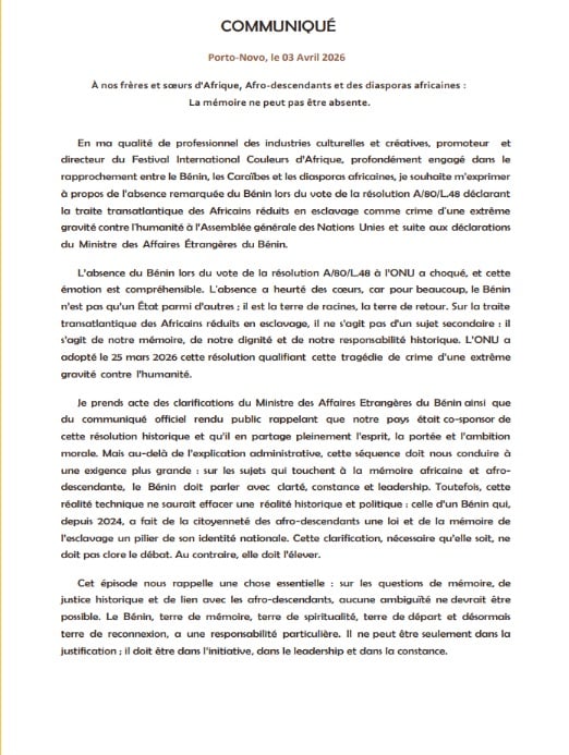 Au‑delà de la controverse, le communiqué appelle à transformer cet épisode en catalyseur d’action : soutenir les initiatives culturelles, renforcer le dialogue avec les afro‑descendants et affirmer le rôle du Bénin comme voix incontournable des combats pour la reconnaissance historique et la justice mémorielle.