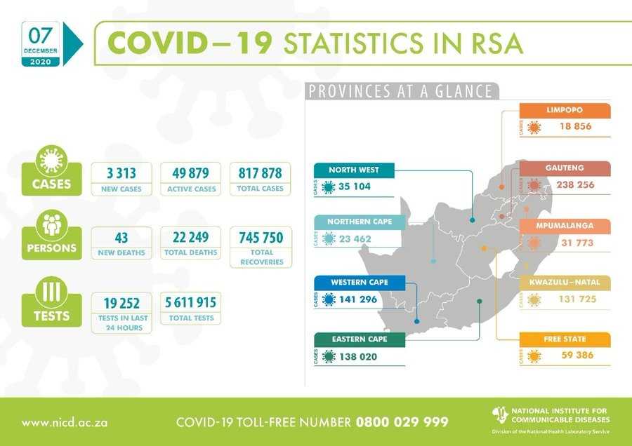 Avec 3 313 nouveaux cas positifs au nouveau Coronavirus pour un total de 19 252 tests effectués au cours des dernières 24 heures, soit un total de plus de 17% de taux de positivité, l’Afrique du Sud reste particulièrement touchée par l’épidémie. 43 décès supplémentaires liés au Covid-19 ont été recensés, pour 139 la veille, ce qui porte le nombre total de décès à 22 249 depuis l’apparition de la maladie.