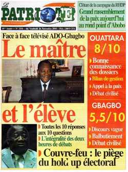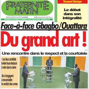 Un exercice inédit en cinquante ans de vie politique et plus de quinze ans de multipartisme en Terre d’Eburnie : un débat entre candidats au second tour de la présidentielle ivoirienne. « Du grand art ! Une rencontre dans le respect et la courtoisie », titrait ce vendredi matin le quotidien public ivoirien Fraternité Matin à propos du face-à-face historique de la veille entre Laurent Gbagbo, le président sortant, et l’ancien Premier ministre Alassane Ouattara. C’est le constat fait presqu’à l’unanimité par ceux qui ont suivi jeudi soir ce débat, dont le journal Notre Voie, proche du régime Gbagbo.
