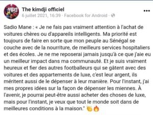 Dans ces propos qu’on lui a attribués, l’enfant de Bambali (Casamance, Sud du Sénégal), soutient : «Je ne fais pas vraiment attention à l’achat de voitures chères ou d’appareils intelligents. Ma priorité est toujours de m’assurer que mon peuple au Sénégal va dans son lit avec de la nourriture, de meilleurs services hospitaliers et des écoles. Je ne me reposerai jamais jusqu’à ce que j’aie eu un meilleur impact dans ma communauté».