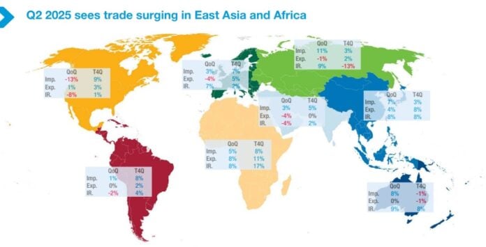 L’Afrique affiche des performances commerciales exceptionnelles au deuxième trimestre 2025, avec une croissance trimestrielle d’environ 6% et une croissance annuelle glissante sur quatre trimestres atteignant près de 10%, se positionnant ainsi comme la région la plus performante au monde en termes de dynamique commerciale.