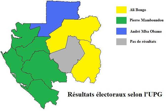 Les résultats globaux de l’UPG donnent l’avantage à Pierre Mamboundou (avec 40,71% des voix). Le candidat, tout comme André Mba Obame, avait affirmé avoir remporté le scrutin dès la fin des opérations de vote. Ali Bongo est classé deuxième (avec 28,86%), suivi d’André Mba Obame (avec 24,68%).