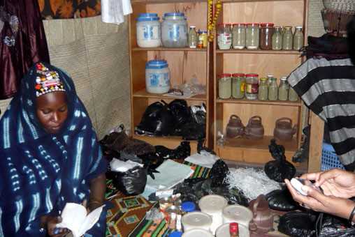 Dans les bidons, bocaux et bouteilles qui encombrent « Le secret de la femme », l’étroit stand de Hadja Fati, quantités de poudres, liquides et autres mixtures. Aux femmes qui viennent lui confier leurs tracas et attentes, elle en explique les vertus : « la poudre verte olive, il faut la boire avec du miel, à 20 heures. Avec ça, ton mari te sent bon comme du miel. La poudre noire, par contre, ça fait pleurer l’homme ! » Sur la composition de ses produits, elle reste très vague. « Il y a des plantes du Niger, et d’autres d’ailleurs, comme l’Arabie saoudite, l’Algérie, le Nigéria, explique-t-elle, mais pour la plupart on les trouve ici.