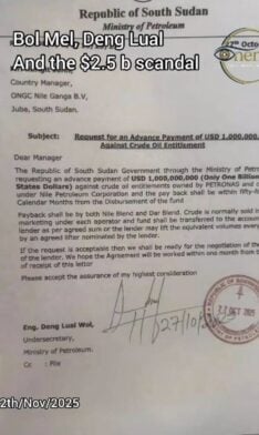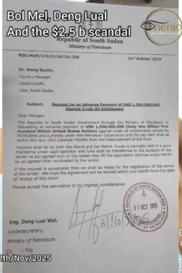 Le Soudan du Sud traverse l’une des crises politiques les plus graves de son histoire récente. Dans la nuit, Deng Lual Wol, figure centrale du ministère du Pétrole, a été placé en résidence surveillée. Les révélations sur la disparition de 700 millions de dollars de revenus pétroliers se doublent désormais de la découverte de deux lettres signées par Wol demandant 2,5 milliards de dollars d’avances secrètes sur le brut national. Une tentative de détournement impliquant Wol, Benjamin Bol Mel et un intermédiaire basé à Addis-Abeba aurait précipité cette purge sans précédent.